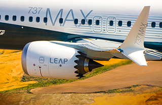 737 MAX 采用新型CFM发动机 LEAP-1B —具有钛前缘的碳纤维风扇叶片、发动机壳体后部呈“V”字型设计,以及发动机较之前更大并位于机翼更靠上及更靠前的位置。