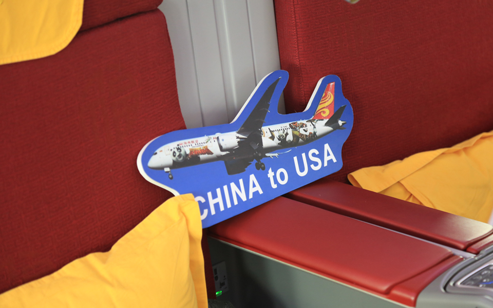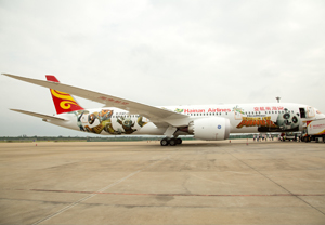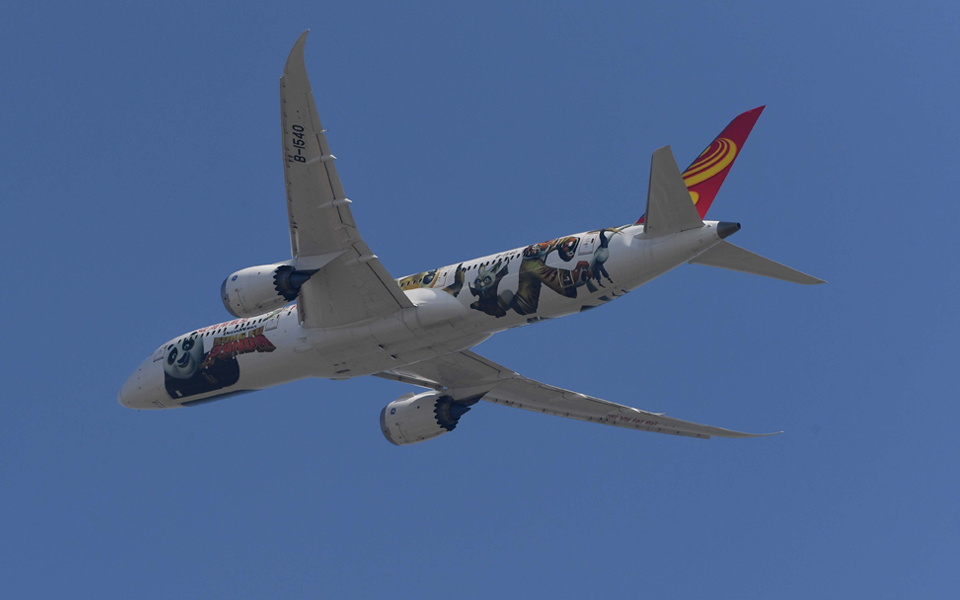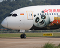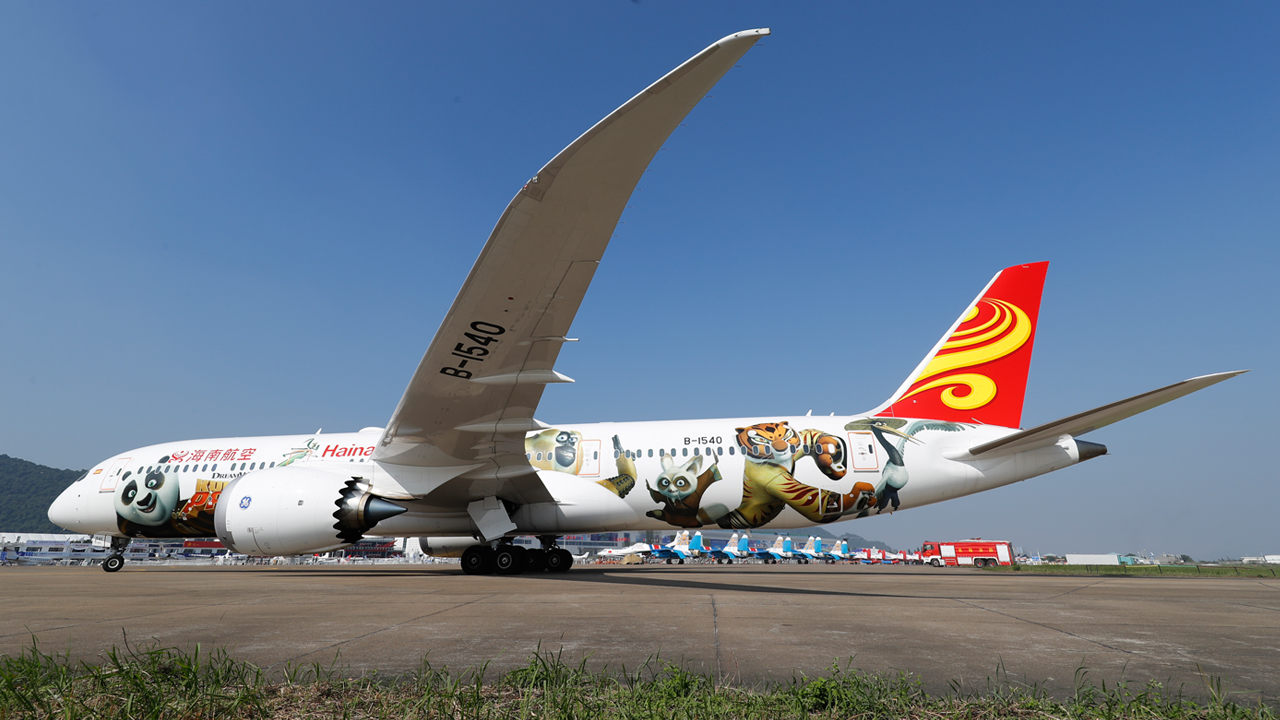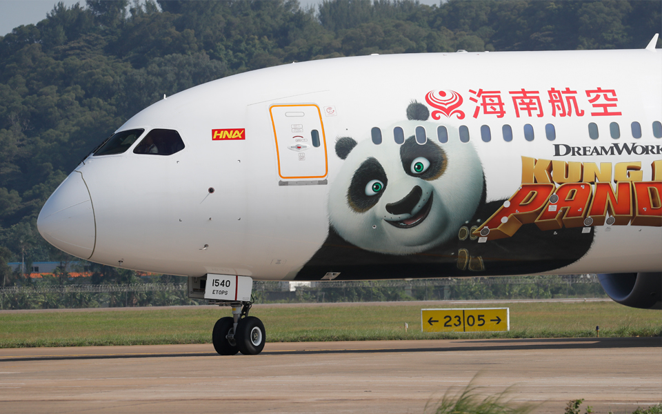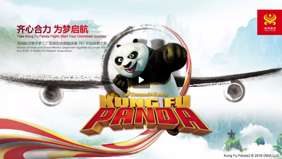 2016年10月1日,海南航空 “功夫熊猫”主题涂装波音787-9飞机惊艳亮相并完成首航,熊猫阿宝、师父、悍娇虎、仙鹤、螳螂、灵蛇、金猴的形象登上同时海航波音787-9飞机。
