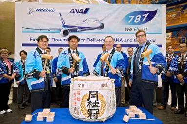 庆祝活动上,波音与全日空共同举行了日本传统的“开酒桶”仪式,用木槌敲开清酒桶的木盖以示祝福。
