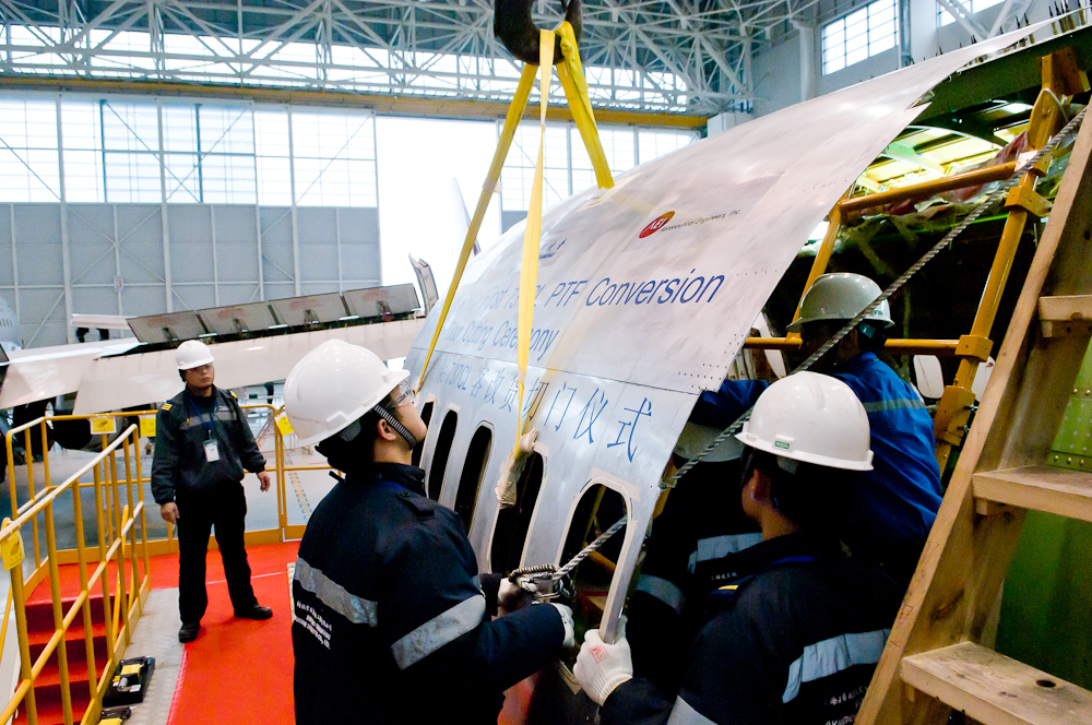 在仪式上,肯尼亚航空技术总监汤姆•欧马•卡都尤 (Tom Ouma Kadoyo),航空工程公司总裁罗伊•山德里 (Roy Sandri), 上海波音首席执行官德默特•斯瓦(Dermot Swan)和上海波音运营部总监倪向旭先生共同完成了切门的最后一步,这是客改货项目中的一个重要里程碑。新的门框结构及主货舱门将于稍晚时候安装在该架飞机上。此次客改货计划于2013年3月完成。