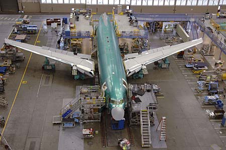 图片中显示的机翼和起落架正在波音位于华盛顿州伦顿的制造厂内被组装到 737-700ER的机身上。飞机一旦进入移动生产线,就将开始最后阶段的组装和内饰的安装。全日本航空公司将于2007年初接收这架飞机。