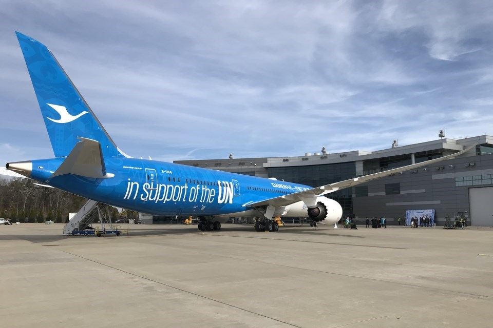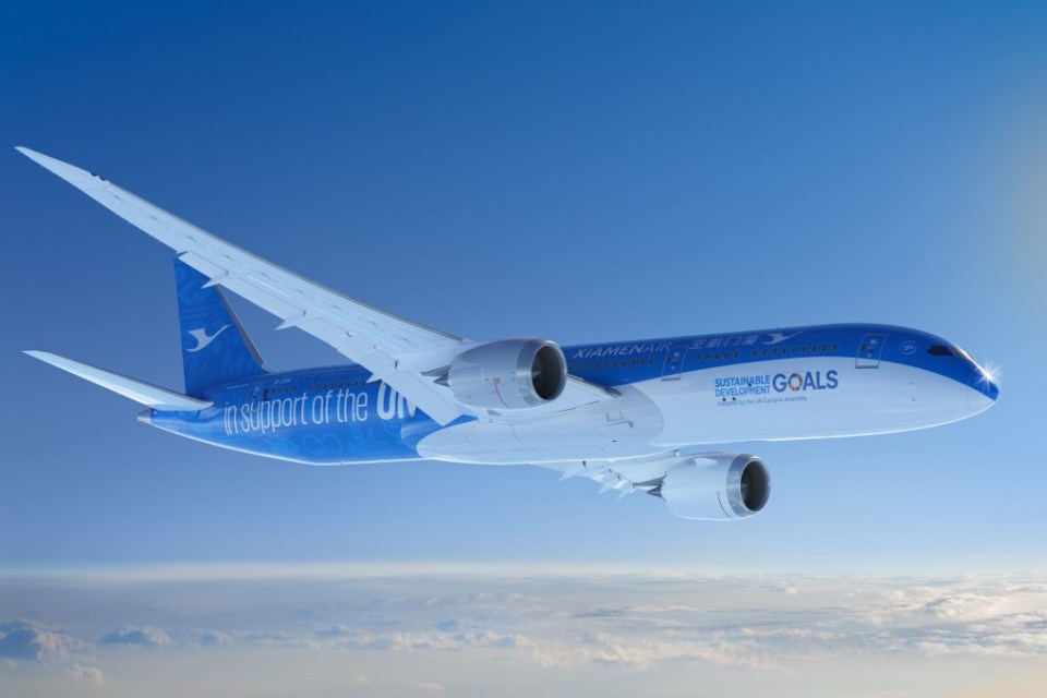 当地时间1月26日,波音在美国查尔斯顿工厂向厦航交付了一架特殊的787-9型飞机,这架飞机是全球唯一经过官方确认的联合国特殊涂装飞机,机身上印有醒目的“in support of the UN”以及可持续发展目标标识。